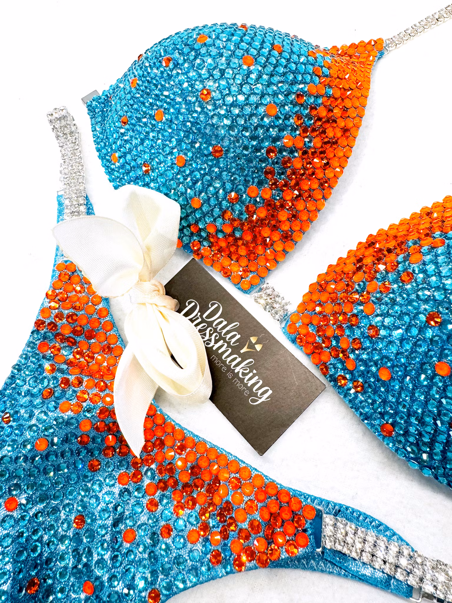 Orange-turkos bikini med connectors sydd för bikini/wellness fitness NPC.